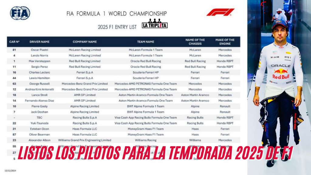 La lista también incluye novedades como Lewis Hamilton en Ferrari y Carlos Sainz en Williams, además del debut de jóvenes talentos como Andrea Kimi Antonelli en Mercedes y Jack Doohan en Alpine. El asiento restante en Red Bull permanece bajo la sigla TBC (por confirmar), manteniendo la incertidumbre sobre el destino de Checo y su vínculo con la escudería de Milton Keynes.