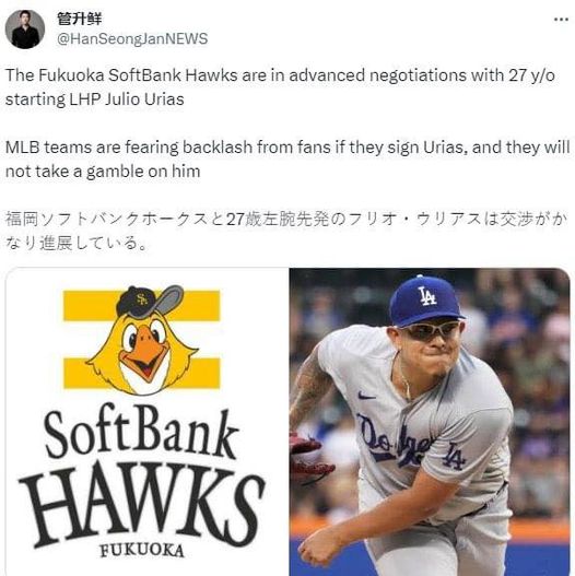 Julio estaría cerca de firmar con el equipo The Fukuoka Softbank Hawks, sumándose al mexicano Roberto Osuna .