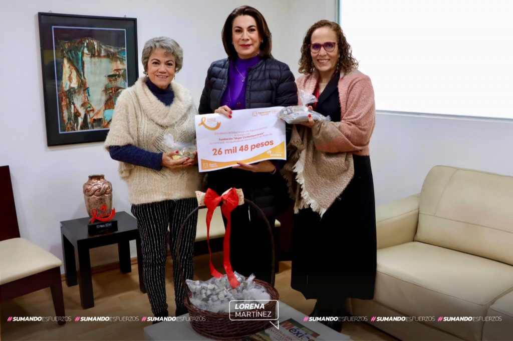 Lorena Martínez, titular del IEA: «Gracias a la generosa participación de las y los integrantes del sector educativo de Aguascalientes y de la sociedad en general, que se unieron a las diferentes actividades que realizamos en el marco del Día Internacional de la Eliminación de la Violencia contra las Mujeres, hoy entregamos un cheque simbólico con lo recaudado a FMujer Contemporánea. Sabemos que este apoyo permitirá que esta fundación continúe realizando un papel importante para brindar casa, vestido y sustento a las mujeres que sufren todo tipo de violencia.»