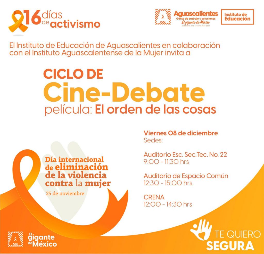 El Instituto de Educación de Aguascalientes (IEA), en colaboración con el Instituto Aguascalentense de la Mujer, invita a la comunidad educativa y público en general al Ciclo de Cine-Debate que se llevará a cabo en el marco del Día Internacional de la Eliminación de la Violencia contra la Mujer.