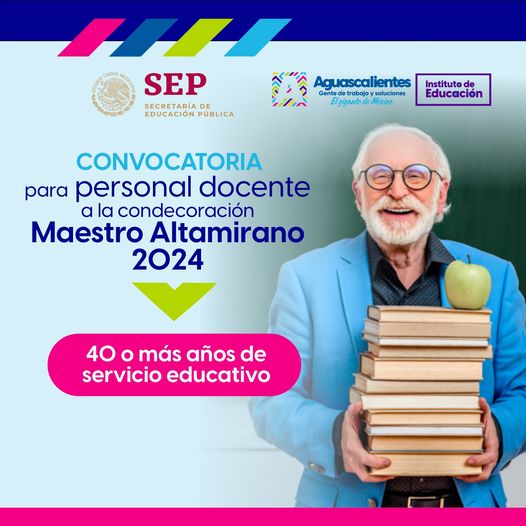 El Instituto de Educación de Aguascalientes (IEA) invita a maestros y maestras con función docente, directiva y/o de supervisión en activo o jubilados que acrediten 40 o más años de servicio a realizar el trámite para hacerse acreedores a la Condecoración “Maestro Altamirano“ 2024, otorgada por el Gobierno Federal, a través de la SEP.