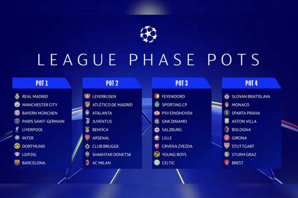 Los equipos se han distribuido en cuatro bombos de acuerdo con su coeficiente UEFA, lo que significa que los clubes con más puntos se ubican en el Bombo 1 y los de menor ranking en el Bombo 4. Entre los posibles enfrentamientos destacan encuentros de alto voltaje como Real Madrid frente a Bayern Munich, Manchester City, Arsenal, o Juventus.