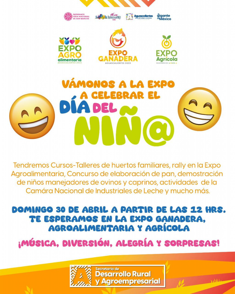 A partir de las 12:00 del mediodía, en la Exposición Ganadera, Agroalimentaria y Agrícola, se desarrollarán actividades especiales para las y los niños. Podrán elaborar su propio pan, aprender a hacer cupcakes, romper piñatas, participar en un rally, aprender a hacer un huerto o visitar las granjitas, entre otras.
