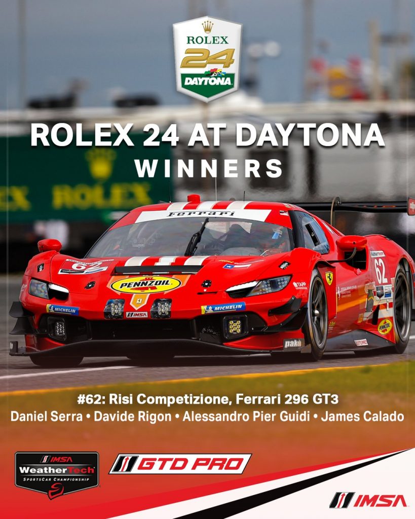 En las clases GTD, Risi Ferrari se llevó la victoria en una competencia donde los líderes cambiaron constantemente durante las 24 horas. La lucha se centró principalmente entre el Ferrari 296 número 62 de Risi Competizione y el BMW M4 número 1 de Paul Miller Racing. A pesar de los desafíos, incluido un problema en los frenos para el BMW, Risi Ferrari mantuvo la ventaja hasta el final.