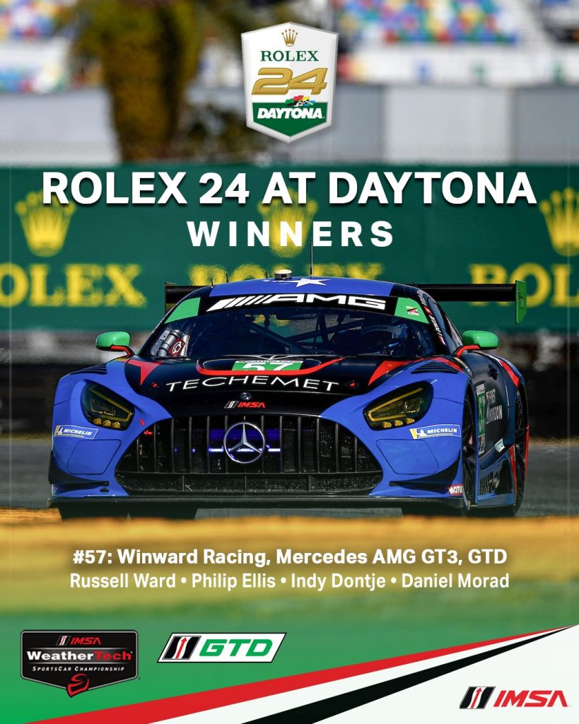 Por otro lado, el Mercedes-AMG GT3 número 57 de Winward Racing dominó la categoría pro-am, liderado por un equipo compuesto por Russell Ward, Philip Ellis, Indy Dontje y Daniel Morad, con este último llevándolo a la victoria.