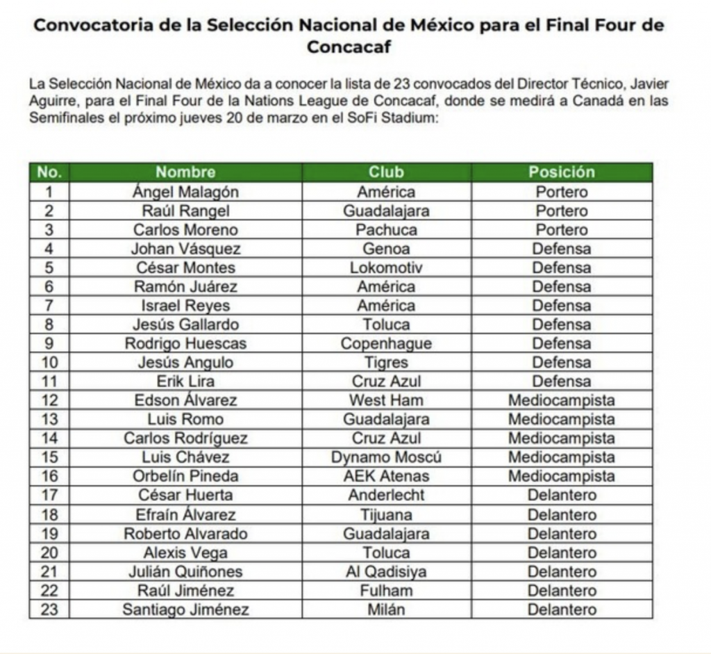 La Federación Mexicana de Futbol dio a conocer la lista de 23 jugadores convocados para disputar la Semifinal de la Nations League de la Concacaf ante Canadá, el próximo 20 de marzo en el SoFi Stadium de Estados Unidos.