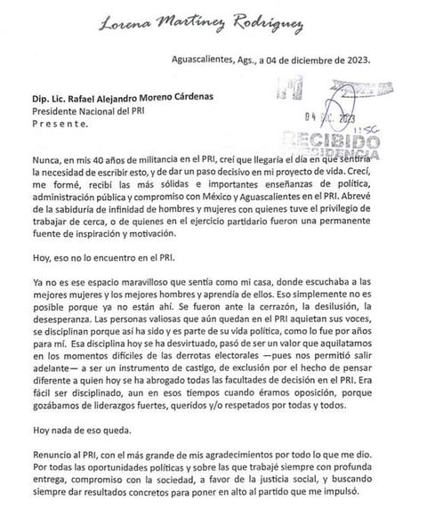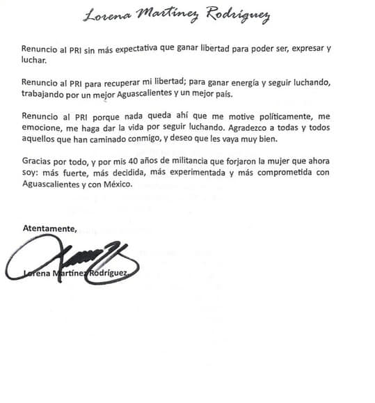 «Renuncio al PRI porque nada queda ahí que me motive políticamente, me emocione, me haga dar la vida por seguir luchando», afirmó Martínez, subrayando su compromiso continuo con Aguascalientes y México.